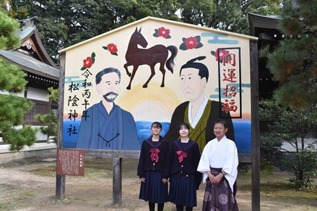 今年は正木退蔵 2025年12月21日 最終更新日時 : 2025年12月21日 hagi 松陰神社に設置された絵馬と萩高美術部の柴田部長、後藤副部長 吉田松陰とその年の干支にちなんだ門下生を描く松陰神社恒例の「特大絵馬」が12月1日、本殿そばに設置された。 共有:クリックして Twitter で共有 (新しいウィンドウで開きます)Facebook で共有するにはクリックしてください (新しいウィンドウで開きます)クリックして友達にメールでリンクを送信 (新しいウィンドウで開きます)